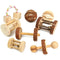 Set includes natural wooden roller toys, dumbbells, and unicycle bells for small pets.